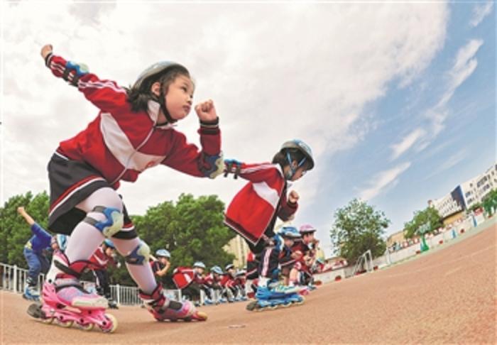 近年来,河北省沧州市广泛开展阳光体育运动,组织实施各具特色的大课间和多种形式的体育活动。图为学生在体育课上练习轮滑。新华社发(苑立伟 摄)