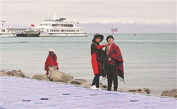 青海湖是我国最大的内陆湖,近年来青海湖生态环境持续向好,整体生态功能增强。图为游客在青海湖二郎剑景区驻足拍照。本报记者 吴丽蓉 摄