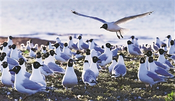 遗鸥在红碱淖的鸟岛上栖息(6月3日摄)。近期,随着气温升高,陕西省神木市红碱淖湿地保护区成了遗鸥的乐园。遗鸥是濒危候鸟,被列入世界自然保护联盟濒危红色名录。新华社记者 陶明 摄