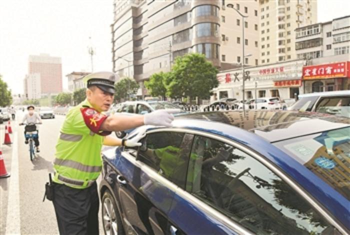 6月7日,太原市交警支队杏花岭大队民警在太原市十二中考点前疏导交通。当天,杏花岭大队共出动警力110人,设置考生服务站2处,集体护送考生302人,单独救助考生3人。本报记者 刘建林 本报通讯员 戎斌 摄