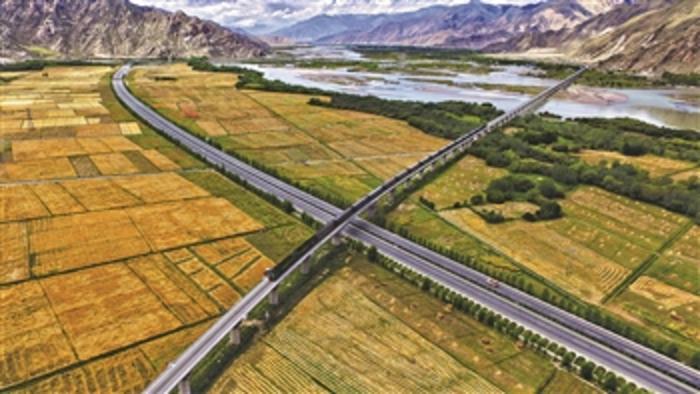 图③:在拉萨曲水县拍摄的公路与铁路。西藏现已形成公路、铁路、航空等多种运输方式为一体的交通网络。新华社记者 普布扎西 摄