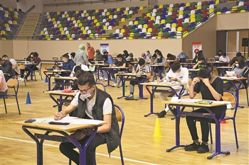 6月8日,戴着口罩的学生在摩洛哥拉巴特参加大学入学考试。 新华社发(查迪 摄)