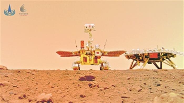 6月11日,国家航天局在北京举行天问一号探测器着陆火星首批科学影像图揭幕仪式,公布了由祝融号火星车拍摄的着陆点全景、火星地形地貌、“中国印迹”和“着巡合影”等影像图。图为“着巡合影”图。 新华社发 (国家航天局供图)