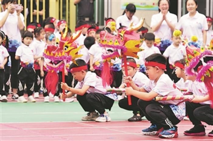 6月10日,重庆市北碚区缙云幼儿园举行迎端午主题活动,孩子们通过参与旱地龙舟、制作香包、画团扇、包粽子等民俗体验活动,感受传统节日的魅力。新华社发(秦廷富 摄)