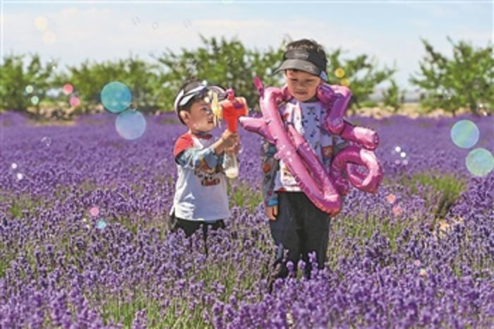 6月13日,小朋友在位于新疆霍城县芦草沟镇四宫村的解忧公主薰衣草农场游玩。进入6月,“中国薰衣草之乡”新疆霍城县5万亩薰衣草竞相绽放,紫色花海香气袭人,吸引了大批游客前来观赏游玩。新华社记者 丁磊 摄