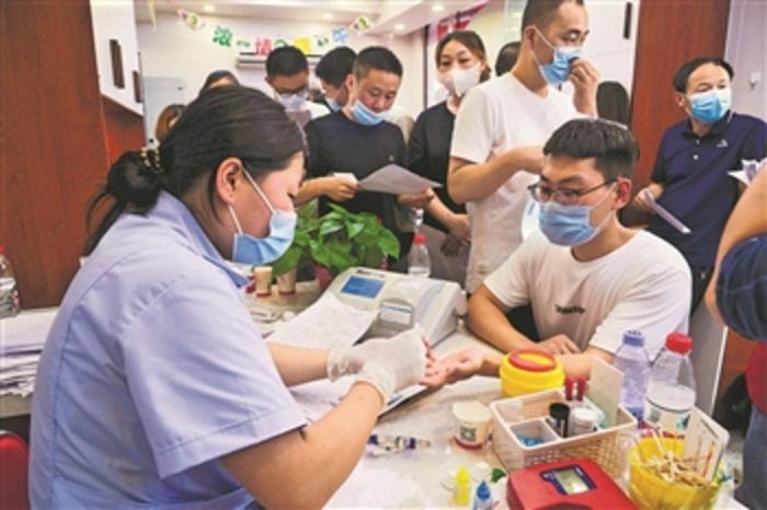 当市民得知各大医院血库告急的信息后,踊跃就近到市内各献血点报名献血。