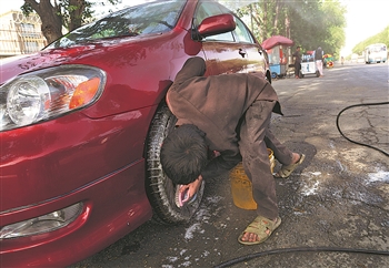 6月11日,一名童工在阿富汗首都喀布尔街头洗车。新华社发(拉赫马图拉·阿里扎达 摄)