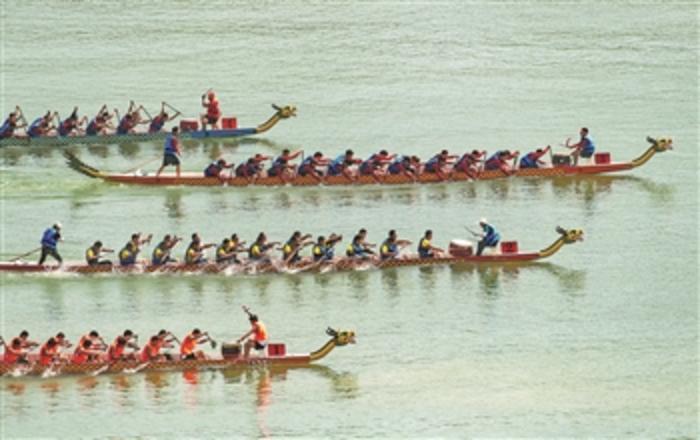 6月14日,端午节,参与竞渡的龙舟在比赛中。当日,屈原故里湖北省宜昌市秭归县在三峡大坝前秭归县水域以龙舟赛的形式过端午节。