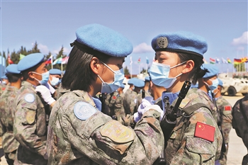 6月16日,中国第19批赴黎巴嫩维和部队授勋仪式在黎巴嫩南部辛尼亚村的中国维和营举行,410名官兵全部被授予联合国和平勋章。图为接受检阅的维和女兵进场前互相整理着装。