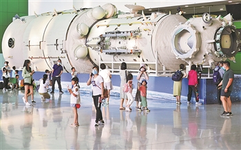 6月19日,不少家长带着孩子来到位于北京市朝阳区的中国科学技术馆,参观“天和核心舱”结构验证件实物,了解中国空间站相关知识。