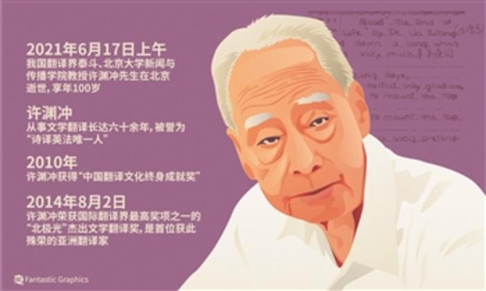 6月17日上午,中国翻译界泰斗、北京大学新闻与传播学院教授许渊冲先生在北京逝世,享年100岁。