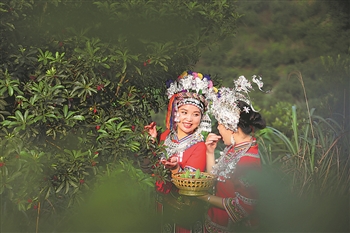 近日,湖南省靖州苗族侗族自治县坳上镇木洞村杨梅生态博物馆,几名游客换上苗族盛装,在梅林里体验采摘。该县杨梅种植面积达10万亩,杨梅采摘游成为当地的一张特色旅游名片。 本报通讯员 刘杰华 刘艺德 摄