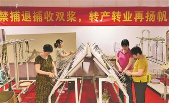 近年来,长临河镇通过培训提高退捕渔民就业技能,同时设立就业车间,并采取灵活上班、按件取酬的形式,帮助渔民实现转产就业。许庆勇 摄/中新社