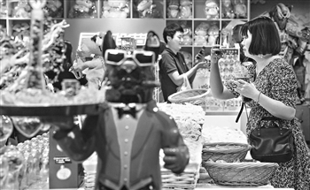图为前不久,北京前门大街的一家零食店里,顾客们正在选购零食。