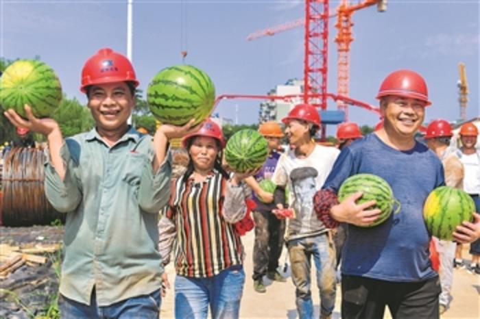 6月22日,浙江省湖州市长兴县工人文化宫迁建项目工地,一线工人领取爱心西瓜。当日,长兴县城投集团组织党员志愿者前往龙山街道帮扶基地现场采摘3000公斤西瓜,并免费派送给在高温下坚守的一线工人,为他们送去清凉。本报通讯员 谭云俸 摄