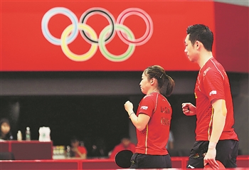 6月21日,许昕/刘诗雯(左)在混双比赛中庆祝得分。他们最终以4比2战胜林高远/张瑞。当日,在山东威海进行的中国国家乒乓球队备战东京奥运会热身赛混合双打循环赛中,许昕/刘诗雯以四轮全胜的战绩摘得冠军,林高远/张端、王楚钦/王曼昱分获第二、三名。新华社发(中国乒协供图)