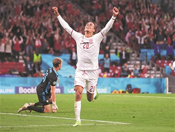 6月21日,丹麦队球员波尔森庆祝进球。当日,在丹麦哥本哈根进行的欧洲足球锦标赛B组小组赛中,丹麦队以4比1战胜俄罗斯队,以小组第二的成绩晋级16强。
