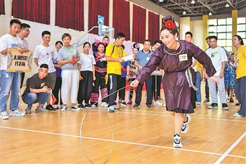 6月23日,浙江省湖州市长兴县举行“石榴花开在长兴 民族团结一家亲”趣味运动会,来自乡镇街道、企业、职教中心云贵班等18支各民族代表队的选手,参加了摸石过河、滚铁环、走高跷等趣味运动项目。活泼新颖的比赛形式吸引了众多职工围观,场上欢声笑语不断。本报通讯员 谭云俸 摄