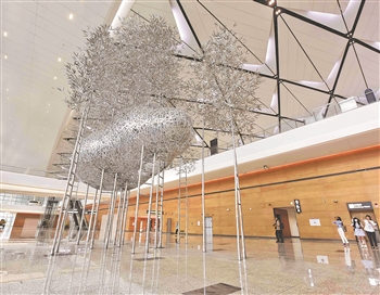 这是6月23日拍摄的成都天府国际机场T1航站楼迎宾厅内陈设的艺术装置。