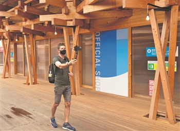 6月20日,一名记者在东京奥运会奥运村的官方商店外拍摄。当日,东京奥运会奥运村对媒体开放,记者参观了奥运村国际区、公寓、餐厅、健身房等地。新华社记者 王子江 摄