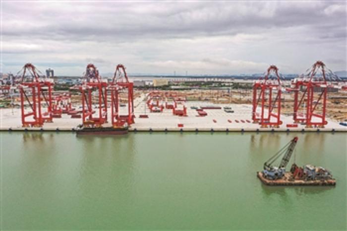 该码头采用“单小车自动化岸桥、北斗导航无人驾驶智能集卡、堆场水平布置侧面装卸、港区全自动化”运作方案,是粤港澳大湾区首个全自动化码头。(无人机照片)