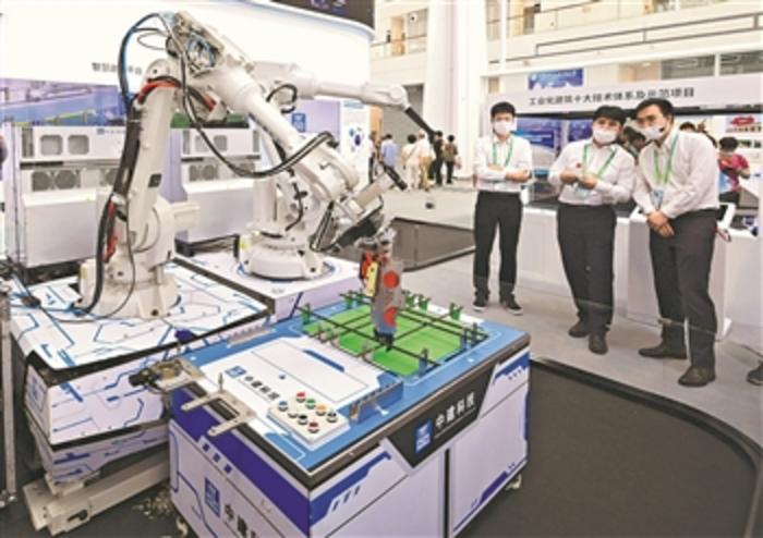 6月24日,观众在国家会展中心(天津)一期展馆内参观中建科技的一款机器设备。