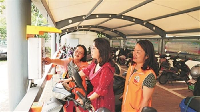 6月24日,“清风志愿者服务队”的成员在南昌市青山湖区和苑小区指导居民使用电瓶车充电装置。