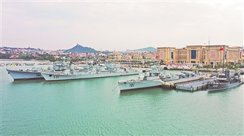 6月26日,中国人民解放军海军博物馆在山东省青岛市举行开馆仪式。这是海上舰艇展区(无人机照片)。新华社发(江帆 摄)