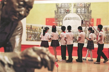6月23日,北京,来自灯市口小学的少先队员正在中国美术馆内参观“伟大征程 时代画卷——庆祝中国共产党成立100周年美术作品展”。据了解,该展览共展出来自全国各大美术机构的经典藏品和“国家主题性美术创作项目”推出的现实题材美术作品420余件,分为序章和“开辟新天地”“建设新中国”“迈步新时期”“奋进新时代”四大篇章。众多精品力作浓墨重彩地抒写了新时代中国特色社会主义的伟大实践,绘就了气象万千、壮阔恢宏的时代长卷。