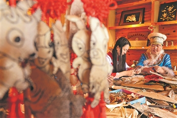 赫哲人王海珠(右)在同江市八岔赫哲族乡八岔村海珠手工艺品农民专业合作社里传授鱼皮制品的制作技术(6月18日摄)。