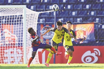 6月27日,广州队球员阮赛(中)与泰国港口队球员约翰·巴焦(左)在比赛中争顶。当日,在泰国武里南进行的2021赛季亚洲足球冠军联赛小组赛中,广州队以0比3不敌泰国港口队。新华社发