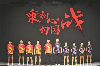 6月23日,中国乒乓球男队队员王楚钦、许昕、樊振东、马龙、主教练秦志戬和女队主教练李隼、队员陈梦、孙颖莎、刘诗雯、王曼昱(从左至右)身穿奥运全新战袍集体亮相。新华社记者 朱峥 摄