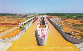 而在引江济淮运河“头顶”上,另一条河——淠河总干渠凌空而过,通过架设钢渡槽的方式,100吨级的船舶可以从“河上有河”的“水桥”上驶过。新时代的淮河治理一直在稳健推进。