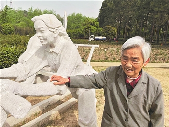 图③:许芳华与记录着当年参与龙河口水库建设的自己的雕像合影。