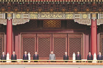 上午7时53分,在欢快的乐曲声中,习近平等党和国家领导人来到天安门城楼主席台,全场爆发出热烈掌声。