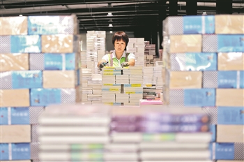 7月2日,在永清县三圣口乡一家图书文化企业仓储中心,工作人员在整理图书。