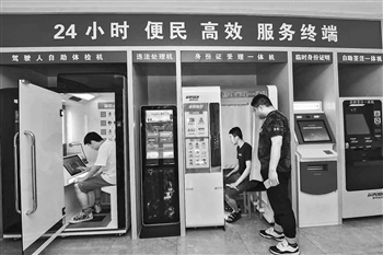 山东省青州市近日打造的24小时自助“智慧警局”启用。“智慧警局”内安装了驾驶人自助体检机、交通违法处理机、身份证受理一体机、临时身份证明办理机、自助签注一体机等终端设备,实现了“进一扇门、办多件事”“零距离、不打烊”,切实让群众享受便利。