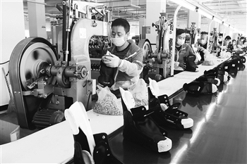 7月7日,在张家口高新区冰雪运动装备产业园,工人在一家冰球鞋生产企业车间工作。近年来,河北张家口紧抓冬奥机遇,大力发展冰雪运动的同时发展冰雪装备制造产业,延伸冰雪产业链条。新华社发(武殿森 摄)