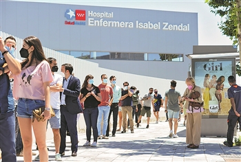 7月7日,市民在西班牙首都马德里的伊莎贝尔·森达尔医院外冒着烈日排队等候接种新冠疫苗。近期,西班牙新冠疫情有所反弹。新华社发(古斯塔沃·巴连特 摄)