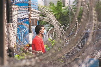 7月11日,在马来西亚吉隆坡郊区一个实行“加强行动管制令”的社区,一名居民隔着铁丝网向外张望。