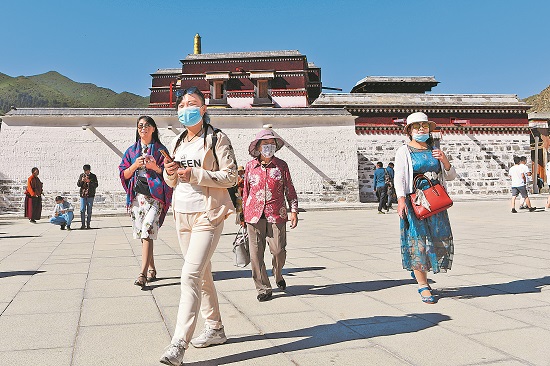 7月12日,游客在拉卜楞寺参观。位于甘肃省甘南藏族自治州夏河县的拉卜楞寺始建于1709年,1982年被确定为全国重点文物保护单位。此次保护修缮工程是建寺300多年来首次大规模整体保护修缮,目前已基本完工。新华社记者 陈斌 摄