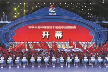 7月12日,第十四届全国学生运动会在青岛开幕。教育部体育卫生与艺术教育司司长、运动会组委会秘书长王登峰表示,本届全国学生运动会共有33支代表队参加,运动员总人数7200人左右,裁判员1200人,各地工作人员约1000人,还有服务大会的志愿者3000人,工作人员1600人,另外还有参加科学论文报告会的专家和学者,总计约14000人。他表示,这将是最后一届全国学生运动会,取而代之的是将于2023年在广西举办的第一届全国学生(青年)运动会。图为运动队代表在开幕式上。新华社记者 李紫恒 摄