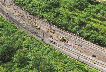 7月14日,工作人员在太焦铁路东坡到孔庄间线路上整修轨道(无人机照片)。