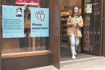 7月12日,一名戴口罩的女子走出英国伦敦一家超市。