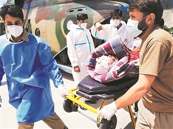 7月14日,在巴基斯坦吉尔吉特,人们将伤员运往医院。