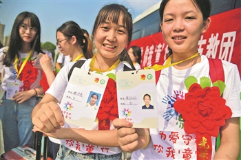 7月14日,江苏大学志愿者赴徐州市沛县开展暑期公益支教。当日,江苏大学“为爱守护 你我‘童’行”支教团的10名大学生志愿者出征,赴沛县大屯镇大屯村开展为期一个月的暑期公益支教活动,为当地的留守儿童送去关爱。本报通讯员 石玉成 摄