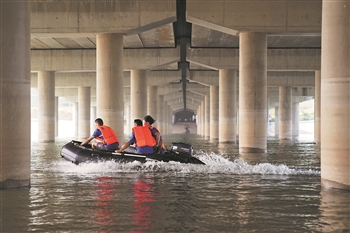 7月14日,河北省邢台市城管局工作人员驾驶冲锋舟进行搜救“落水人员”演练。