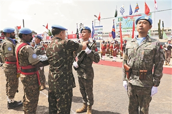7月12日,中国第24批赴刚果(金)维和部队218名官兵被授予联合国“和平勋章”。图为在刚果(金)布卡武中国维和部队营区举行的授勋仪式。新华社发