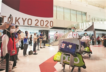7月18日,中国女子曲棍球队成员抵达东京成田机场。当日,参加东京奥运会的中国体育代表团部分成员抵达东京。 新华社记者 李一博 摄