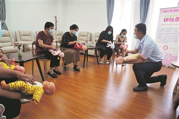 7月14日,在上海市奉贤区奉浦街道秦塘生活驿站,医生指导家长们学习小儿海姆立克急救法。新华社记者 刘颖 摄